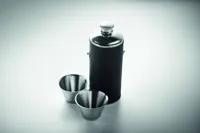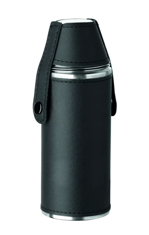 Italtartó rozsdamentes acélból, PU-bőr borítással és 2 darab, 20 ml-es, rozsdamentes acél röviditalos pohárral a fedelében. Űrtartalom: 230 ml.