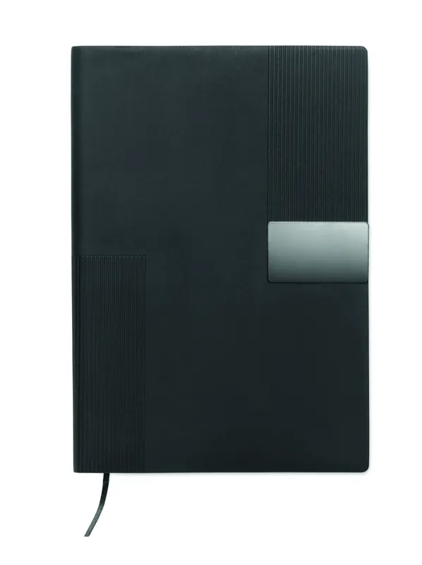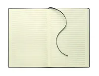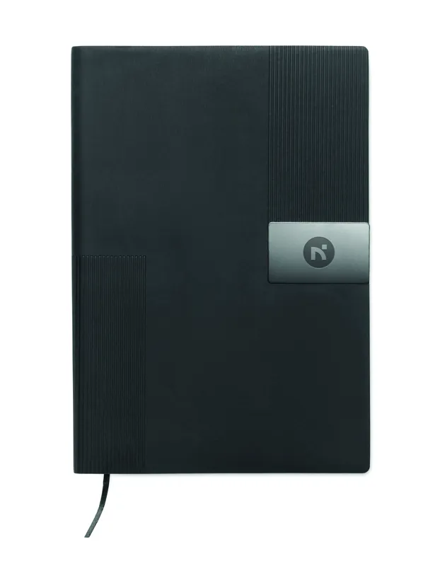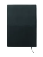 A5 jegyzetfüzet PU puhafedeles borítóval. Cérnafűzött. 160 vonalas oldal (80 lap), újrahasznosított papírból. Illeszkedő színű elasztikus zárópánt és könyvjelző szalag. Fém részlet az elülső oldalon.