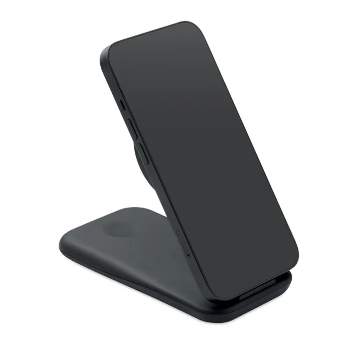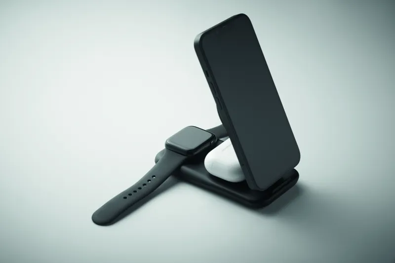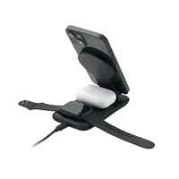 3 az 1-ben ABS töltőállomás. 15 W mágneses vezeték nélküli töltő telefonállvány funkcióval, TWS töltő és okosóra töltő (csak Apple®). iPhone® 12 és újabb készülékekkel kompatibilis. További fémgyűrűt tartalmaz a nem mágneses telefonok támogatásához.