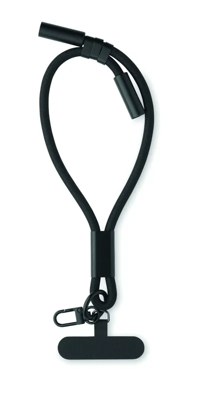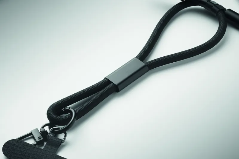 60W-os csuklópántos töltő- és adatkábel. C-típusból C-típusba csatlakozóval. RPET-ből, telefon- és kulcstartóval.