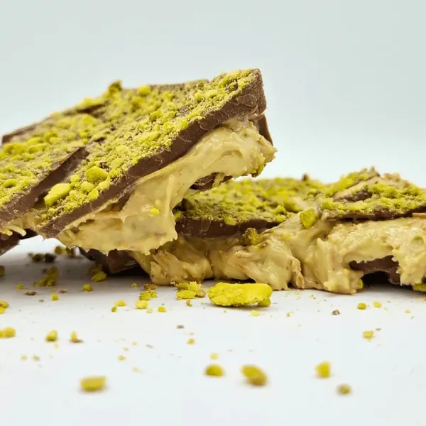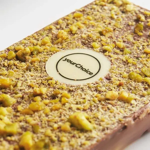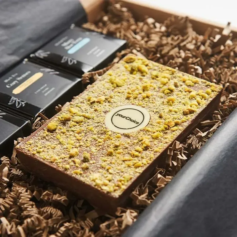 A készlet tartalmaz egy belga gyártmányú Dubai pisztáciás csokoládét (kb. 205 gramm), az Ön csokoládé logójával (kb. Ø 3 cm).