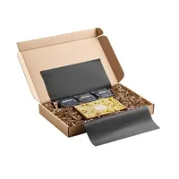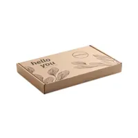 A csokoládé az Ön cégének logójával van testreszabva, így ez az ajándékcsomag nem csak ízletes, hanem egyben professzionális névjegy is. Hozzáadhat egy kísérőkártyát (85x55 mm, 300 g/m²) is, amelynek mindkét oldalára személyes üzenete és logója nyomtatható. A doboz mérete 273x164x30 mm.