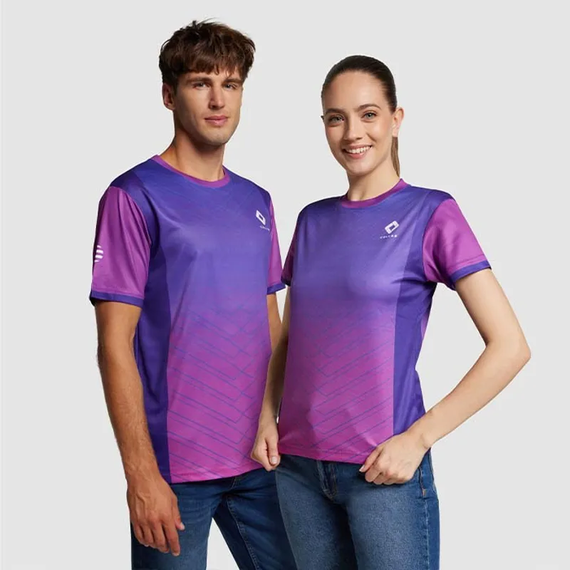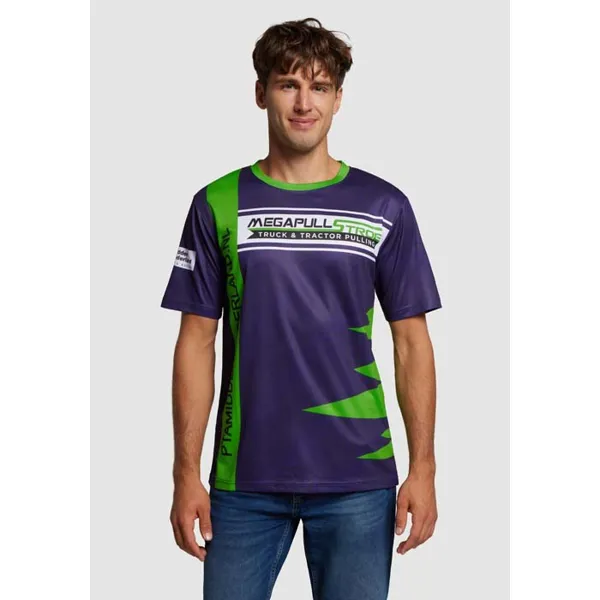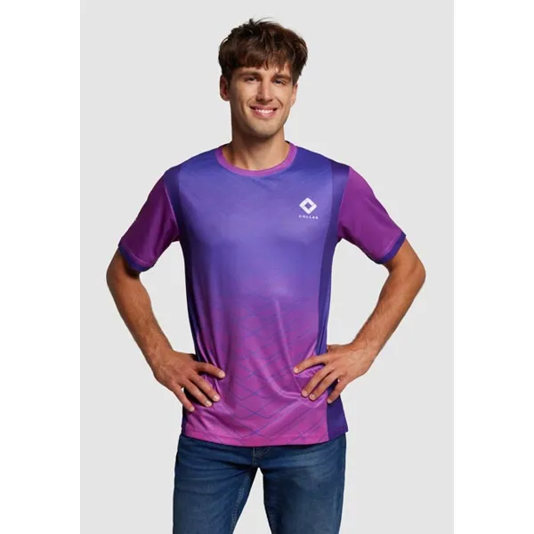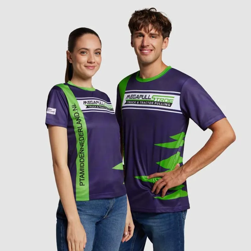 Promóciós, szublimációs, elöl, hátul és az ujjakon teljes felületen emblémázott, kerek nyakú T-Shirt póló poliészterből. Tervezze meg saját kívánt mintáit és logó dizájnját, korlátlan színválasztékkal.