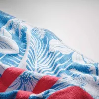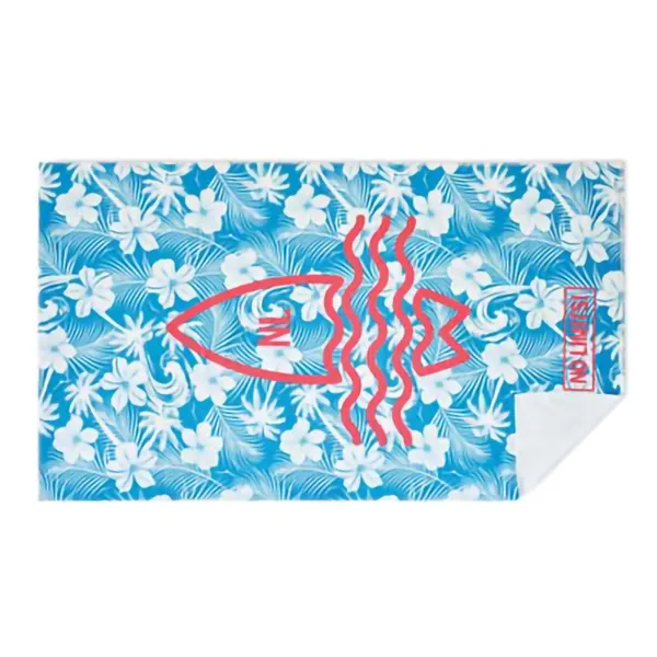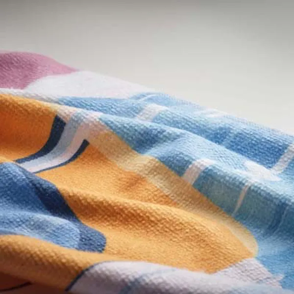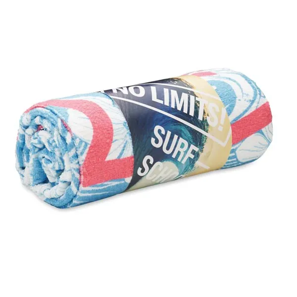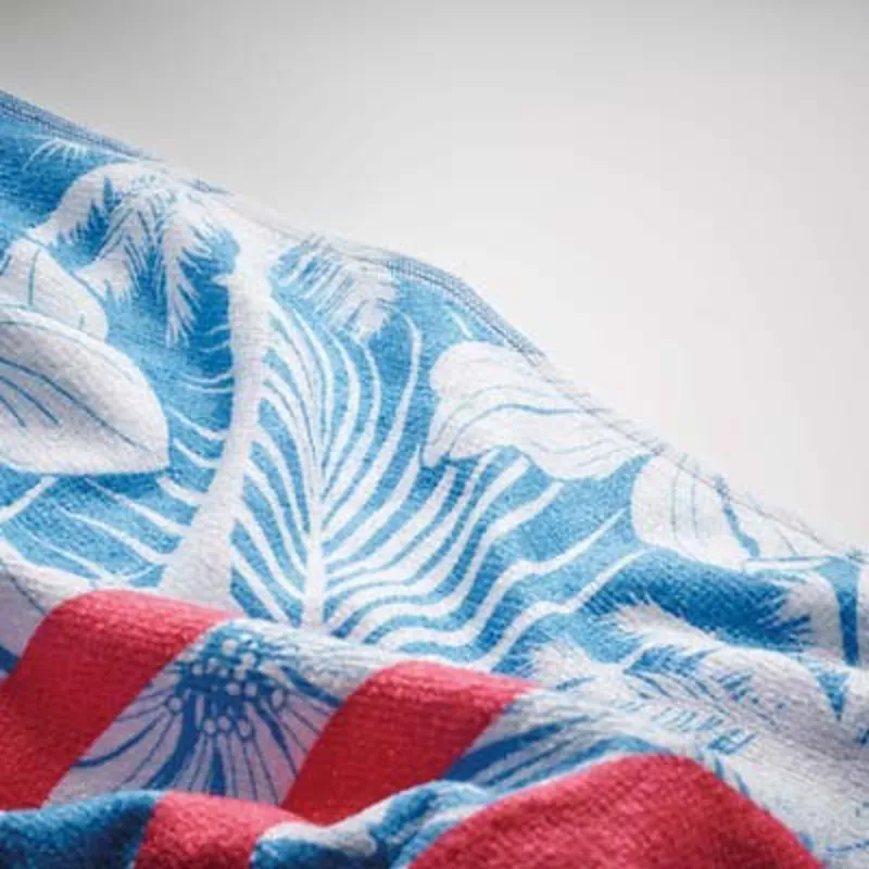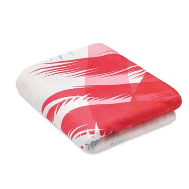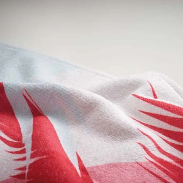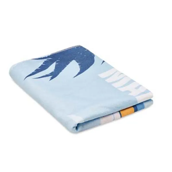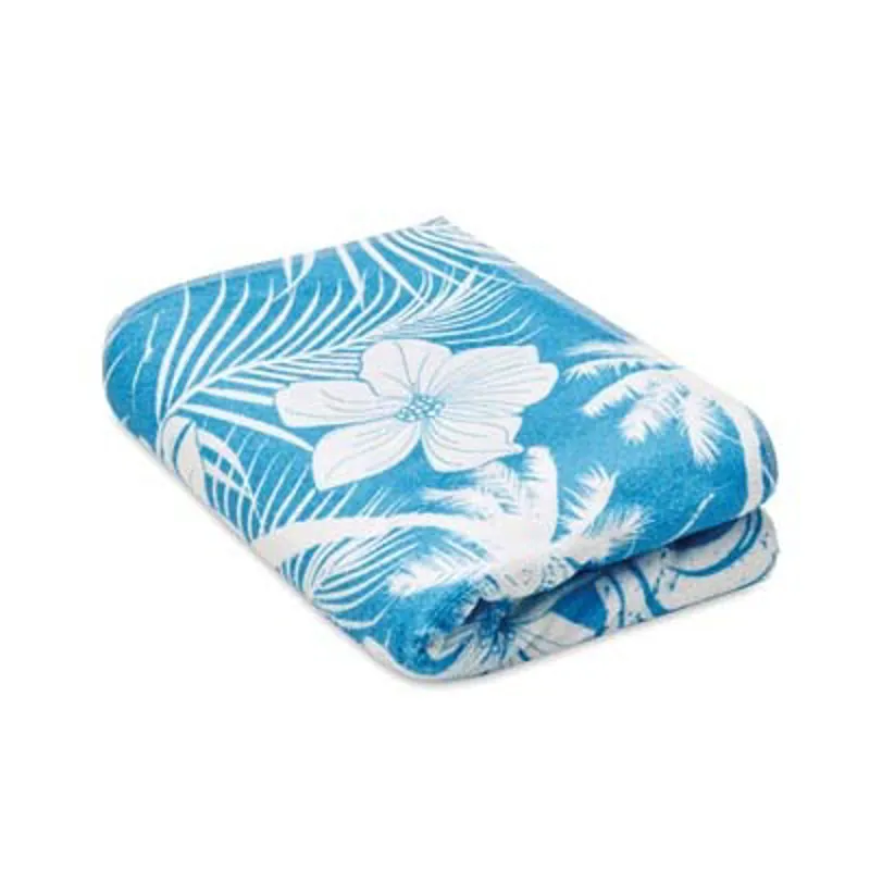 4 szín kolor nyomtatott strandtörölköző poliészterből (50%) és pamutból (50%). A törölköző elülső, velúr poliészter oldala 4 szín kolor nyomtatott, puha textúrájú. A törölköző hátoldala fehér frottír pamut a maximális nedvszívó képesség érdekében.