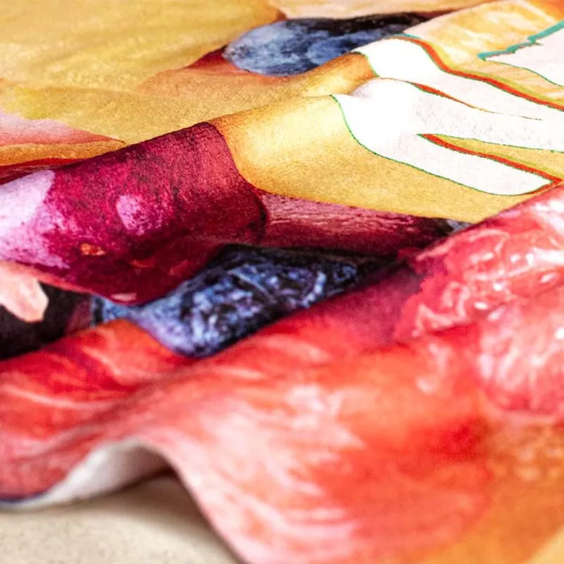 4 szín kolor nyomtatott strandtörölköző poliészterből (40%) és pamutból (60%). A törölköző elülső, velúr poliészter oldala 4 szín kolor nyomtatott, puha textúrájú. A törölköző hátoldala fehér frottír pamut a maximális nedvszívó képesség érdekében.