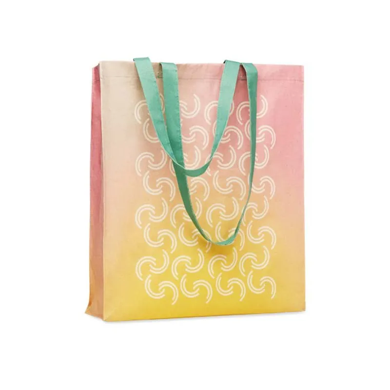 Testreszabható, 100%-ban fogyasztás előtti újrahasznosításból származó pamut bevásárlótáska oldalsó- és talp toldással, hosszú fülekkel. Válasszon a különböző elérhető anyagvastagságok közül, készíttesse el a pamutszatyrokat natúr színben vagy az Ön logójának egyedi színére festve, és adja hozzá saját dizájnját.