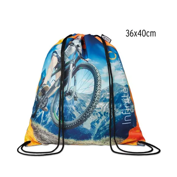 Húzózsinóros táska újrahasznosított poliészter (rPET) anyagból. A húzózsinóros záródás könnyű hozzáférést biztosít a táska tartalmához, ugyanakkor használat közben biztonságosan a helyén tartja azt.