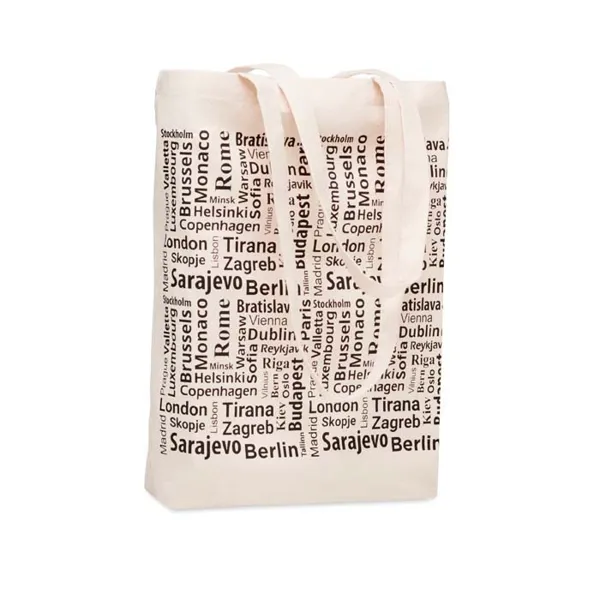 Testreszabható, 100%-ban fogyasztás előtti újrahasznosításból származó pamut bevásárlótáska 10 cm-es talppal és hosszú fülekkel. Válasszon a különböző elérhető anyagvastagságok közül, készíttesse el a pamutszatyrokat natúr színben vagy az Ön logójának egyedi színére festve, és adja hozzá saját dizájnját.