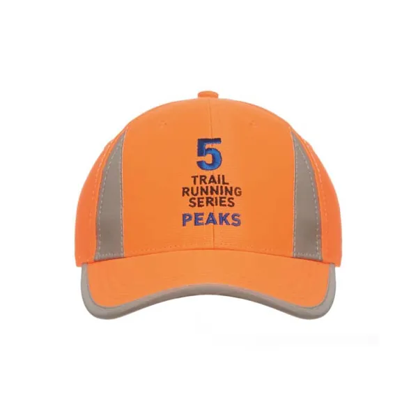 Egyedi 6 paneles baseballsapka rikító színű anyagból, fényvisszaverő szegéllyel az ellenzőn.