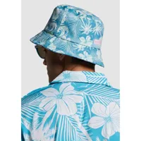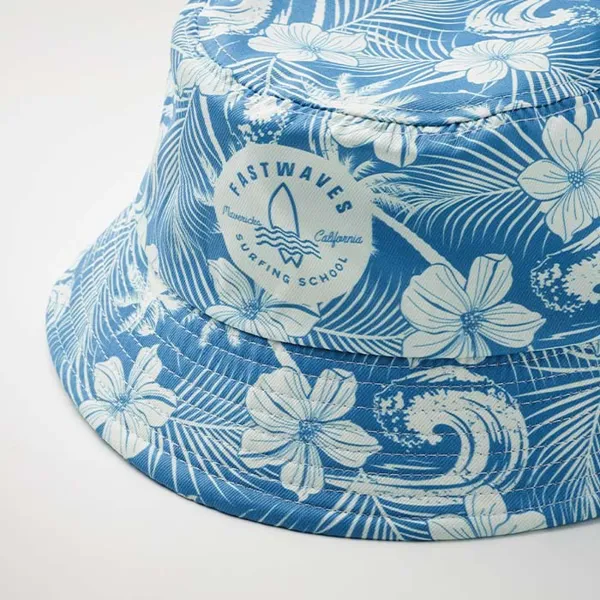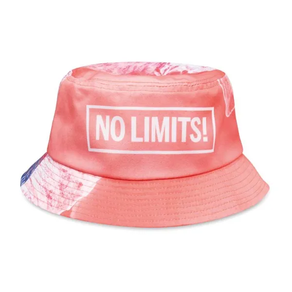 4 szín kolor horgász kalap 150 g/m² vastag fehér poliészterből, az Ön dizájnjával nyomtatva a külső oldal teljes felületén és az 5,5 vagy 7,5 cm-es karima belső oldalán. Az izzadságfelszívó pánt fekete poliészterből készült.