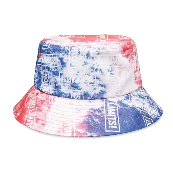 4 szín kolor horgász kalap 260 g/m² vastag fehér poliészterből, az Ön dizájnjával nyomtatva a külső oldal teljes felületén és az 5,5 vagy 7,5 cm-es karima belső oldalán. Az izzadságfelszívó pánt fekete poliészterből készült.