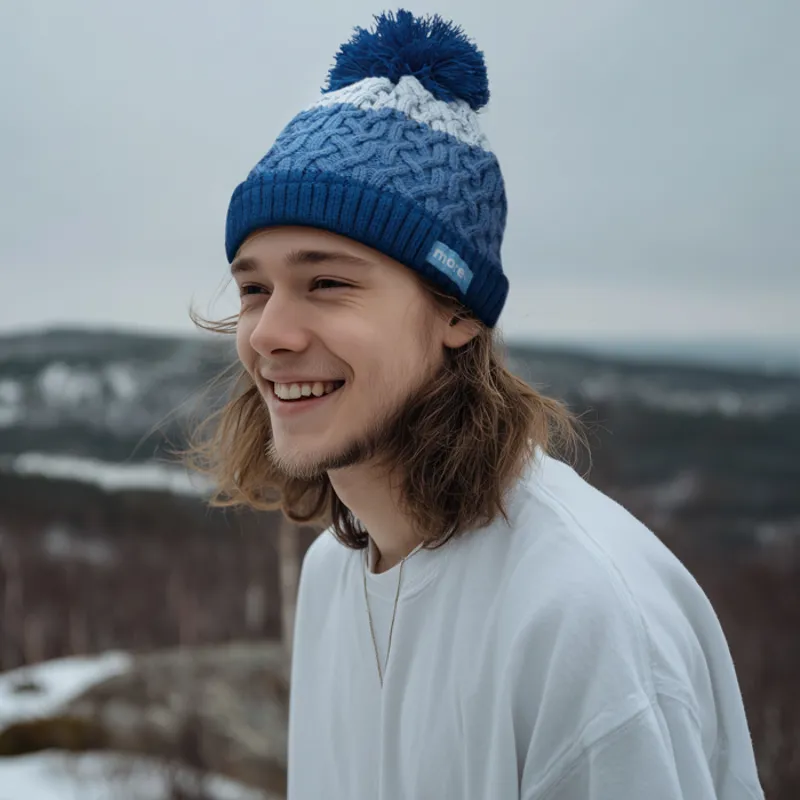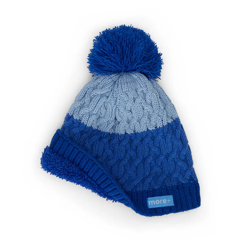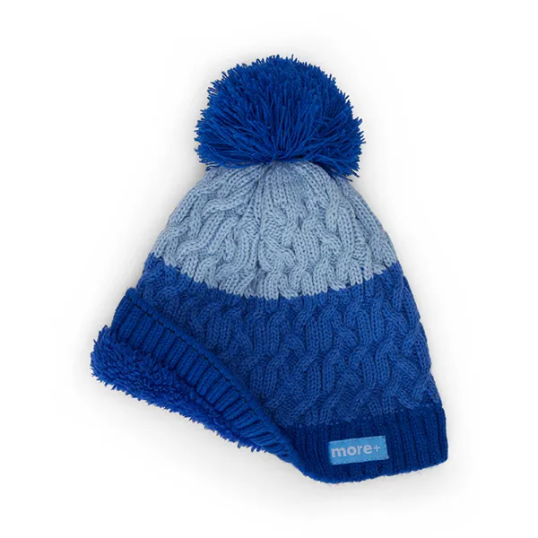 Egyedi csavart mintás, kötött sapka polár béléssel, bordázott mandzsettával és pomponnal.