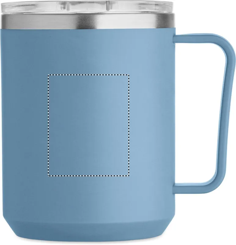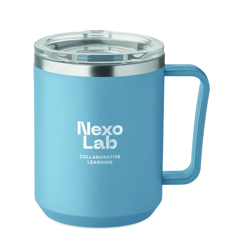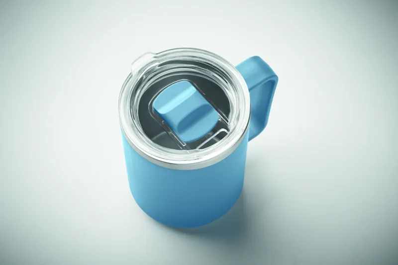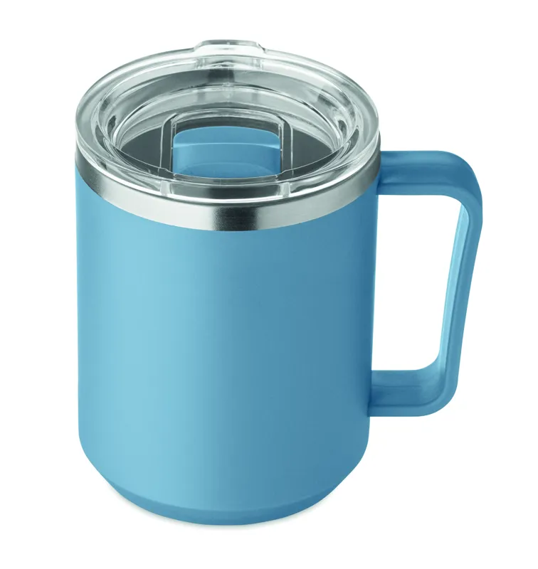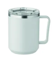 Duplafalú bögre 90 % újrahasznosított rozsdamentes acél és 10 % rozsdamentes acél belsővel, valamint újrahasznosított PP külsővel. Átlátszó AS fedél csúsztatható ivónyílással. Űrtartalom: 400 ml.