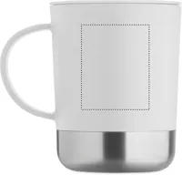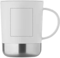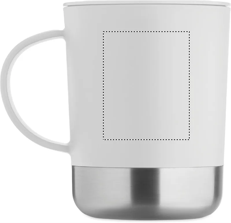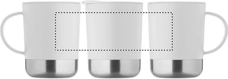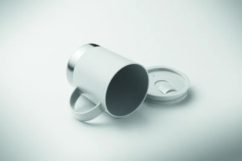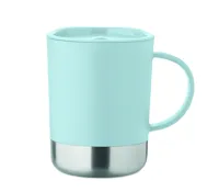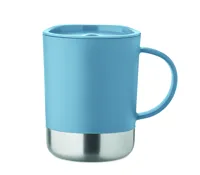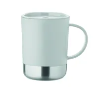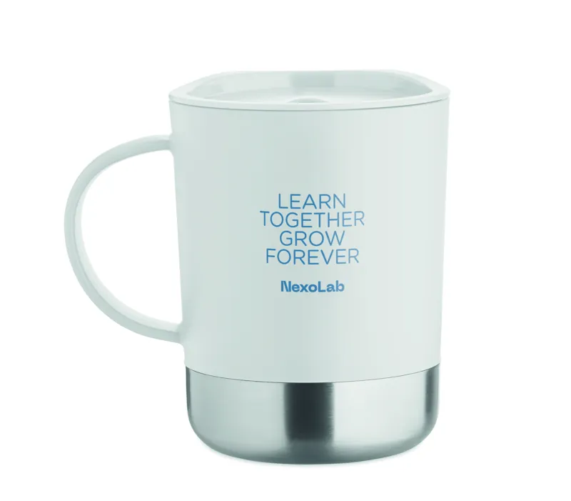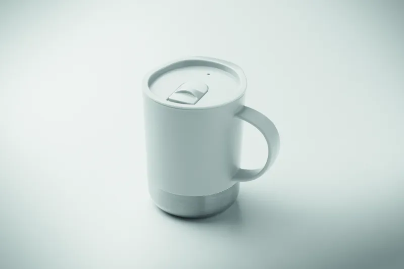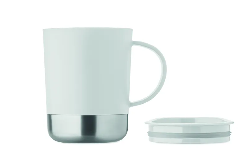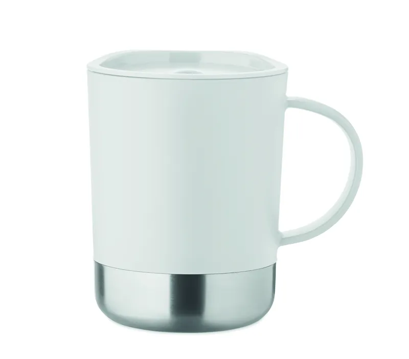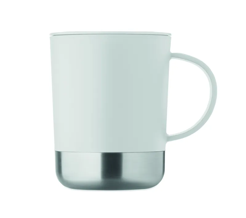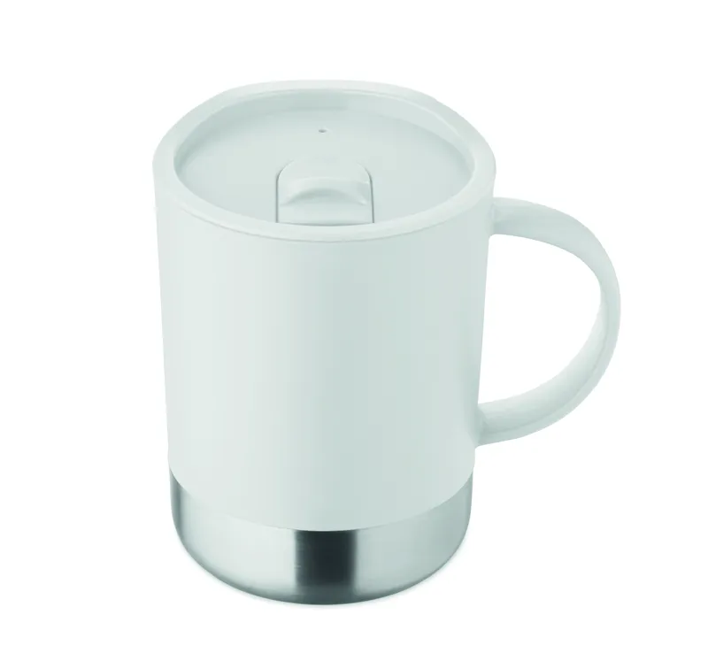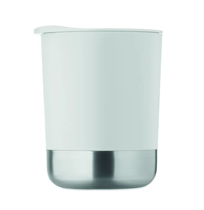 PP bögre újrahasznosított rozsdamentes acél alappal (90% újrahasznosított rozsdamentes acél, 10% rozsdamentes acél) és csúsztatható PP fedéllel. Űrtartalom: 300 ml.