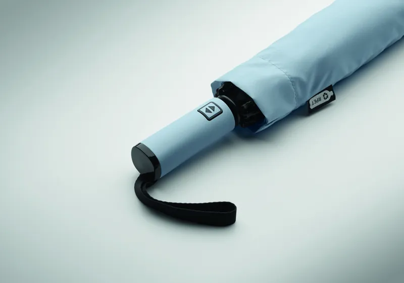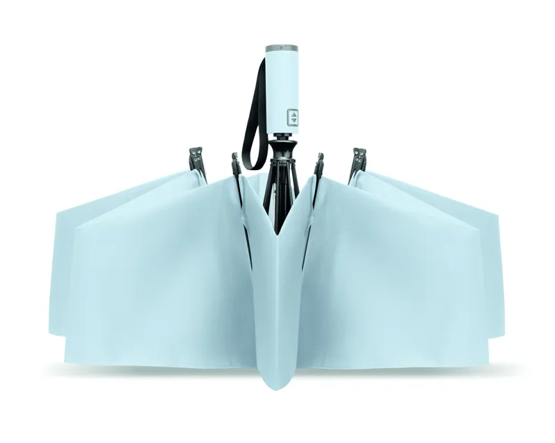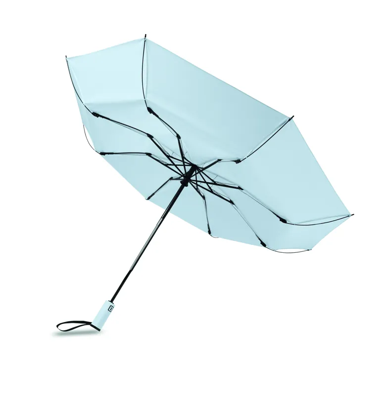 23 colos, 3 szakaszos összecsukható, fordított szélálló esernyő 190T RPET pongee-ból, hozzáillő tokban. Automatikus nyitás és zárás, fekete bevonatos rúd, üvegszálas bordák, gumírozott ABS markolat.