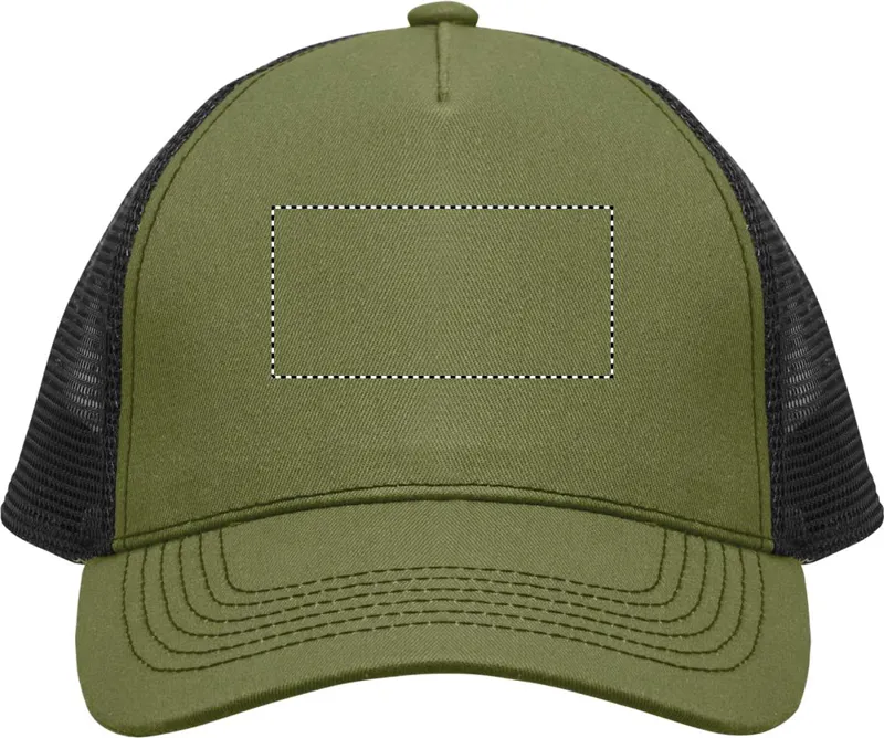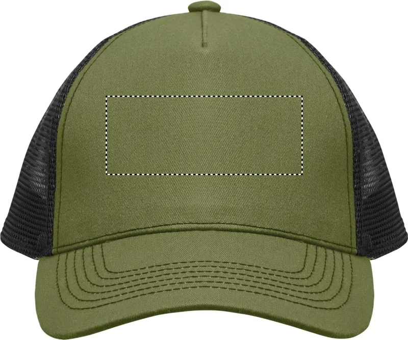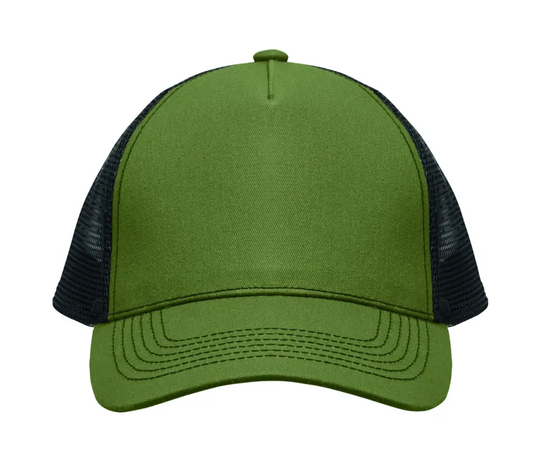 5 paneles kamionos sapka 250 g/m² pamut elülső panellel és ellenzővel, poliészter hálós hátoldallal, tépőzáras záródással.