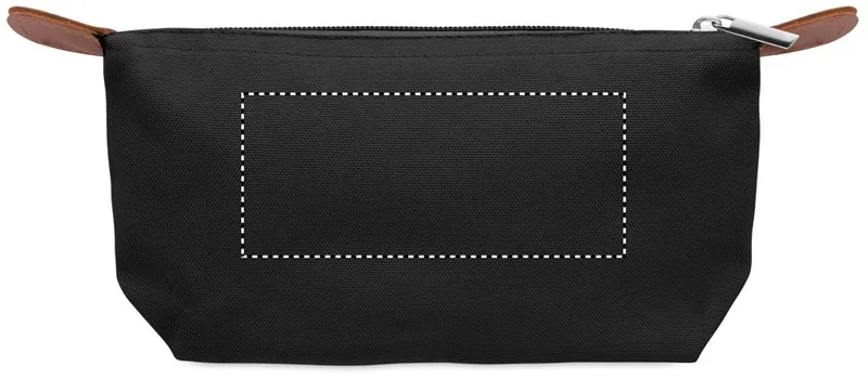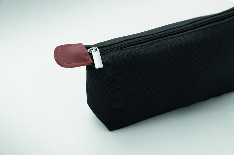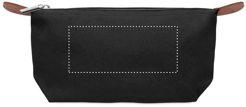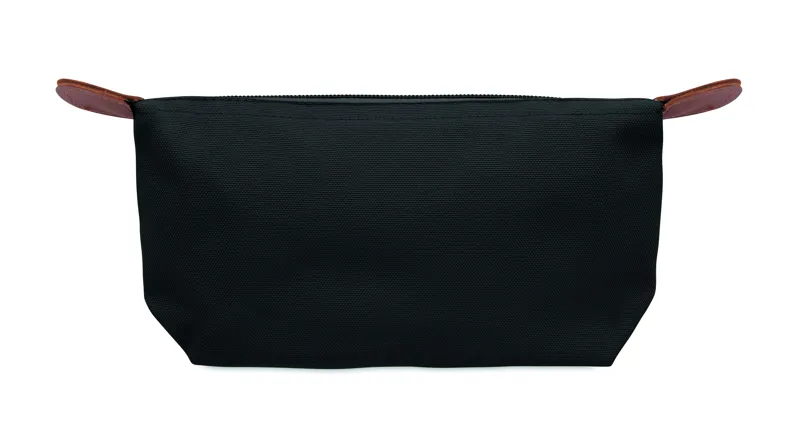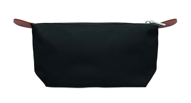 Kozmetikai táska 600D RPET poliészterből, felső cipzáras záródással és barna PU részletekkel.