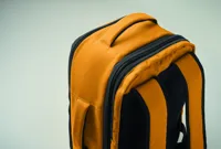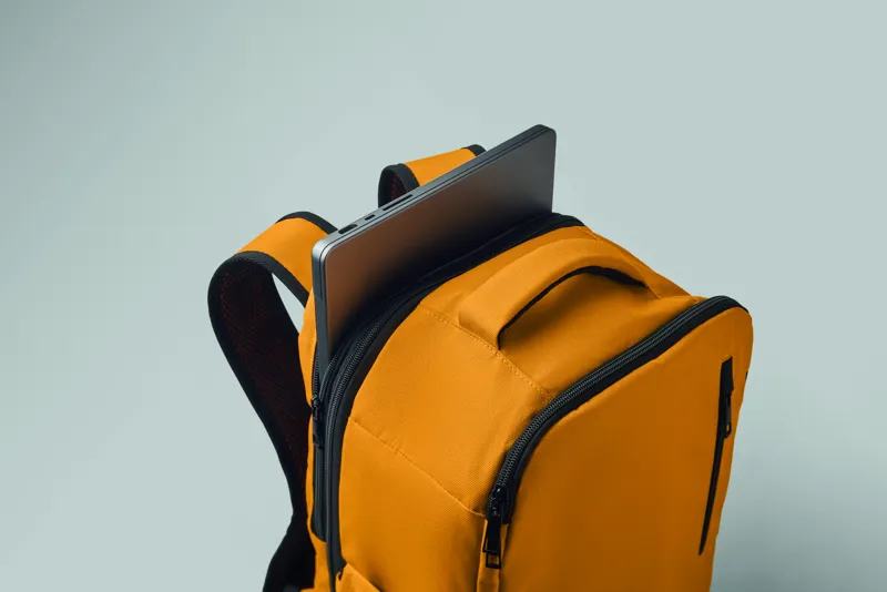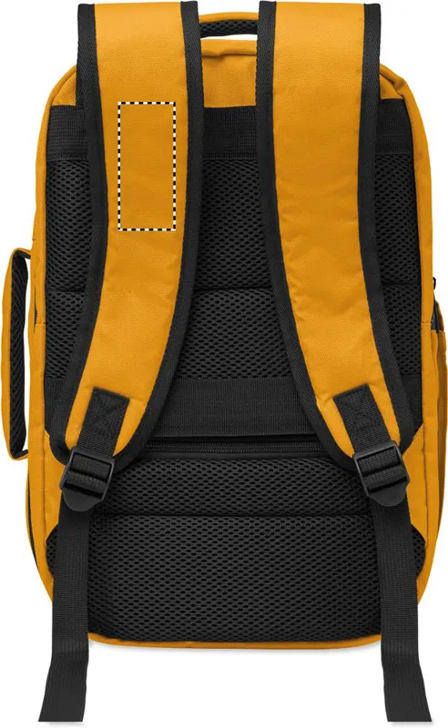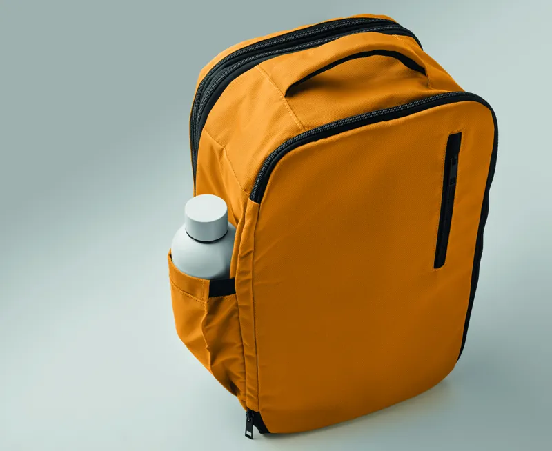 Kabinméretű, bővíthető hátizsák 600D RPET poliészterből, 180°-os nyitással. Fő rekesszel, két nyitott résszel, hálós elválasztóval, párnázott 15 colos laptop rekesszel és bőröndpánttal.