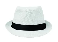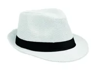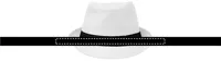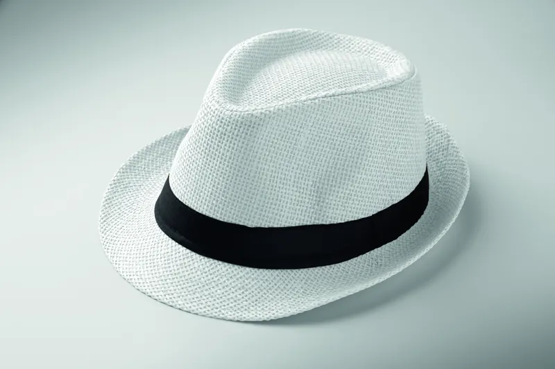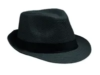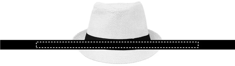 Papír szalmakalap fekete poliészter szalaggal. Embléma nélküli rendelések esetén a szalagot külön, nem a kalaphoz rögzítve szállítjuk.