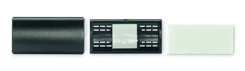 Autós, szellőzőrácsra rögzíthető légfrissítő alumínium fedéllel és ABS csíptetővel. RPET filc betéttel az illatfolyadékhoz (nem tartozék).
