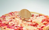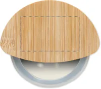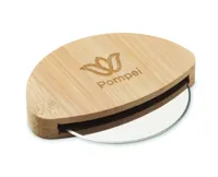Kerek pizzavágó bambusz markolattal és rozsdamentes acél pengével. Áttetsző fehér szilikon védőgyűrűvel.