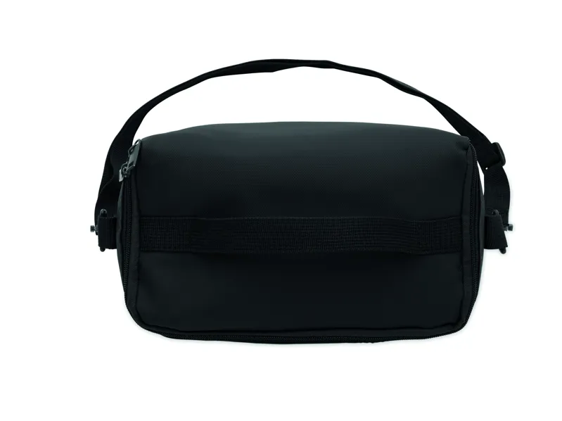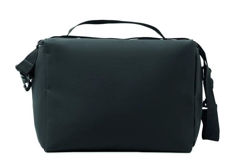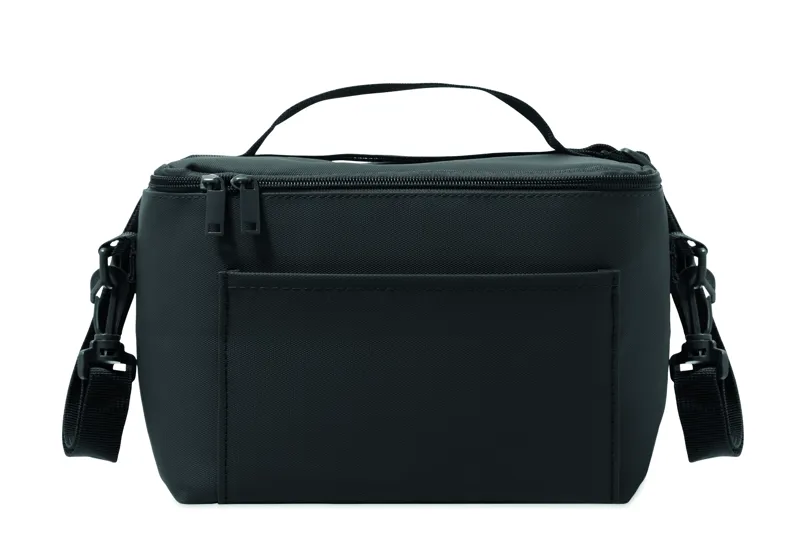 Hűtőtáska PU anyagból, 100 g RPET poliészter béléssel. Elülső zsebbel, fogantyúval és vállpánttal. PE hab és PEVA szigetelés. Űrtartalom: 5,5 l.
