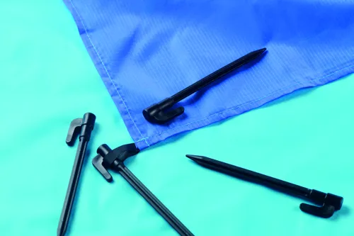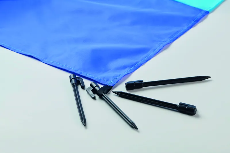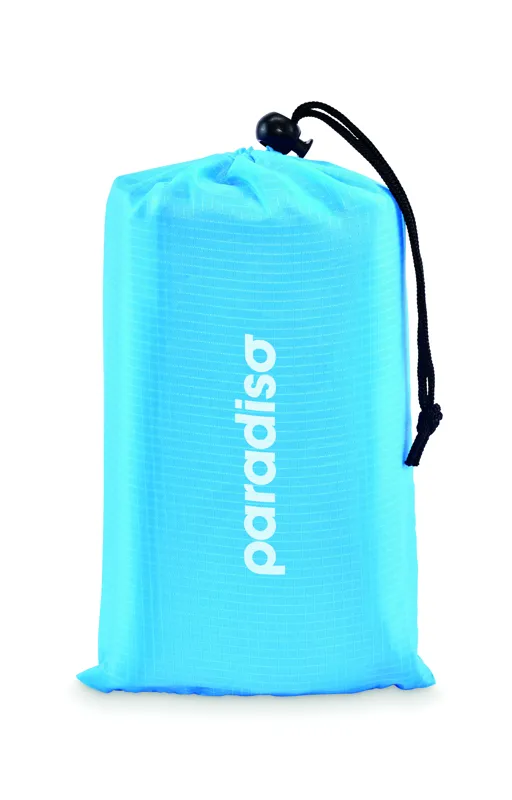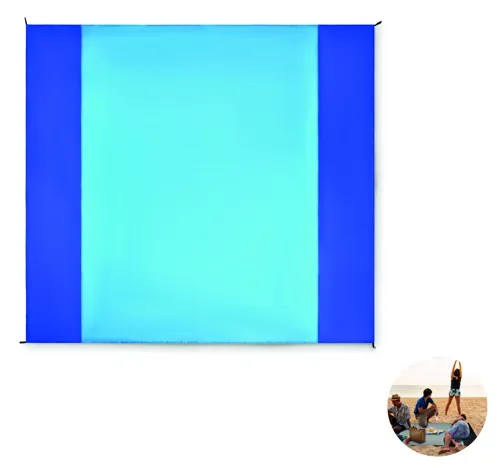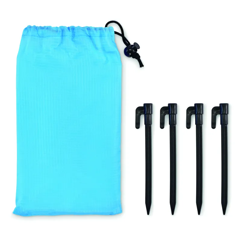 Könnyű, 210T poliészterből készült, 200x210 cm méretű strandszőnyeg. 4 fekete kampóval és hozzá illő, húzózsinóros hordtasakkkal a könnyű szállítás érdekében.