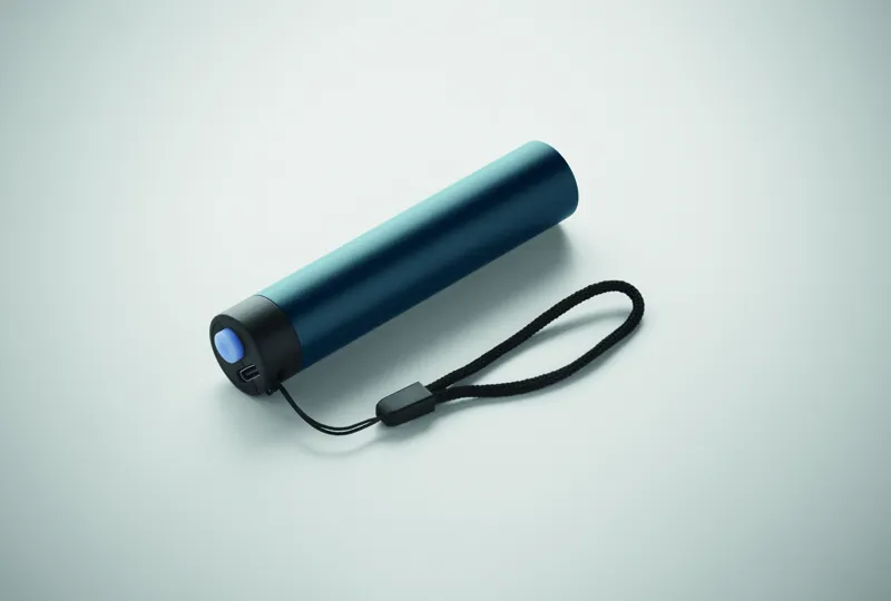 Újratölthető zseblámpa újrahasznosított alumíniumból, 110 lumen fényerővel és 3 világítási fokozattal. Cserélhető, újratölthető 14500 lítium akkumulátorral (400 mAh).