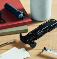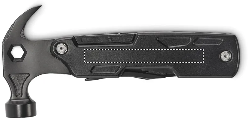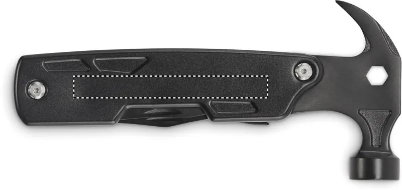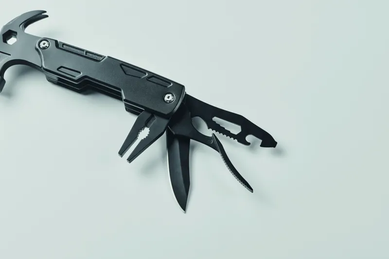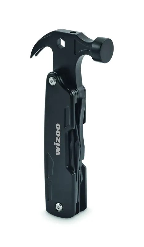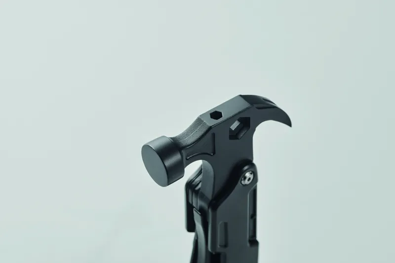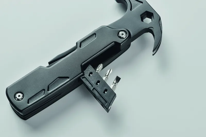 14 az 1-ben rozsdamentes acél multifunkciós kalapács. Tartalmaz szöghúzót, villáskulcsot, fogazott kést, reszelőt, csavarhúzókat, fogót, üvegnyitót, kést és drótvágót.