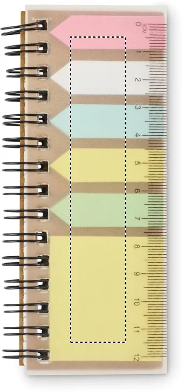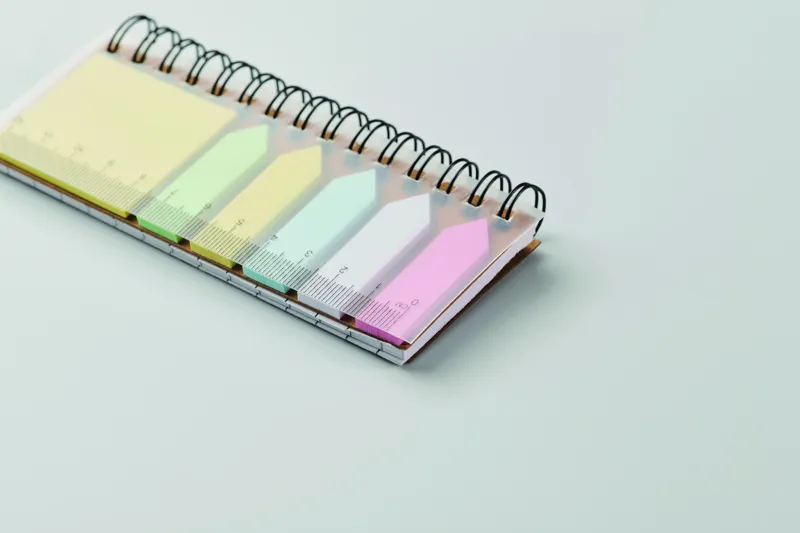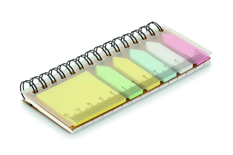 PP jegyzettömb újrahasznosított papírból készült öntapadós jegyzetlapokkal és 5 különböző színű papír könyvjelzővel. Spirálozott.