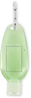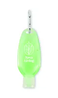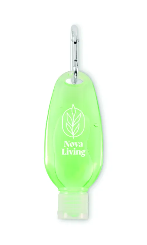 Aloe vera gél 50 ml-es újratölthető PET flakonban, PP felpattintható kupakkal és alumínium karabinerrel. Átlátszó zöld gél, ideális utazáshoz.