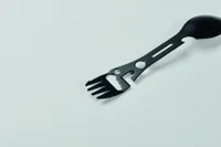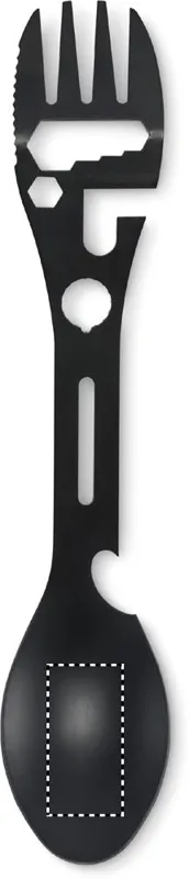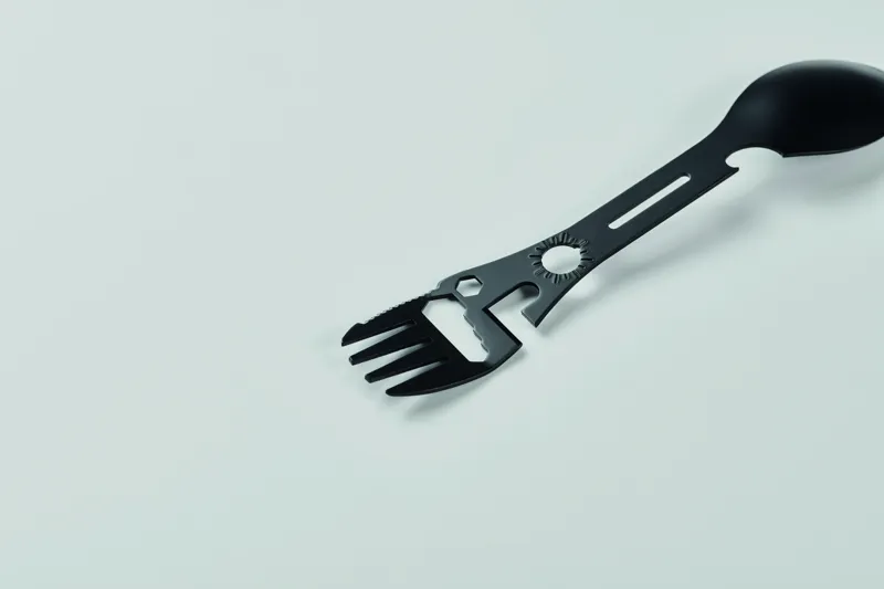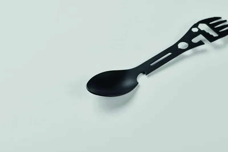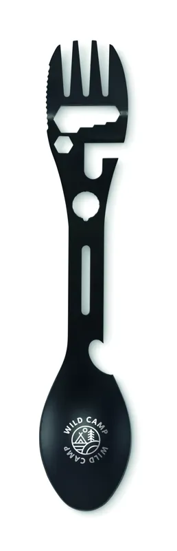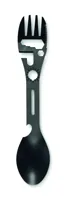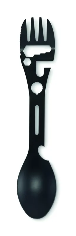 Rozsdamentes acél multifunkciós evőeszköz. Tartalmaz kanalat, villát, állítható villáskulcsot, üvegnyitót, imbuszkulcsot, fogazott kést, nyitót és csavarkulcsot.