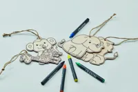 Színező készlet 4 db fából készült, állat formájú függesztékkel, juta zsinórral és 5 zsírkrétával, nemszőtt húzózsinóros tasakban. Ideális kreatív játékhoz és dekorációhoz.