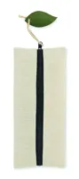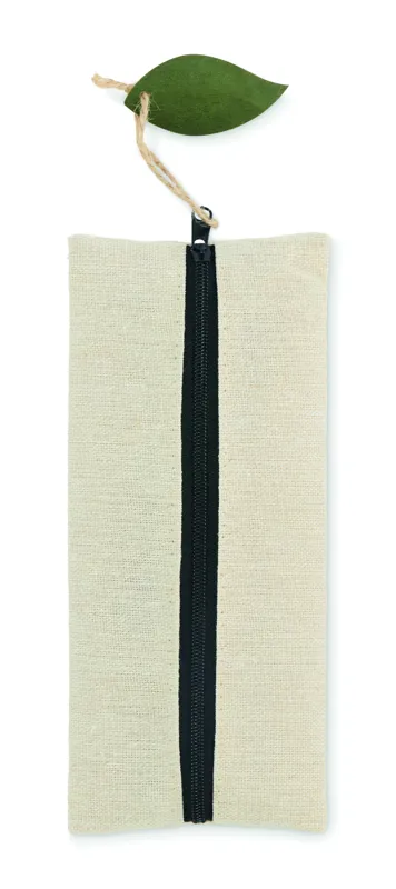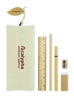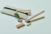 Írószerkészlet jutából és pamutból készült tokban. Tartalmaz 15 cm-es fa vonalzót, fa ceruzát, papírtestű golyóstollat, radírt és fa hegyezőt. Természetes megjelenésű, többször használható tok.