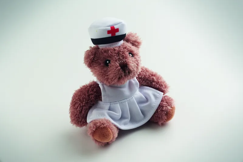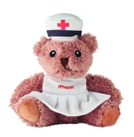 Poliészter plüss mackó nővér ruhában, fehér, nyomtatott pólóban. Hímzett szemekkel, orral és szájjal.