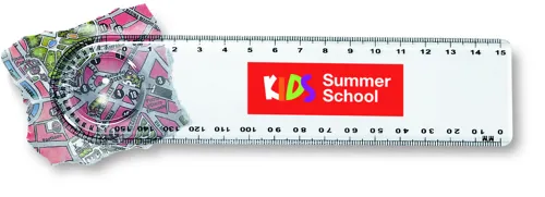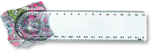 15 cm-es műanyag vonalzó nagyítóval és szögmérővel.
