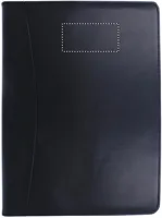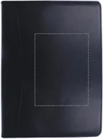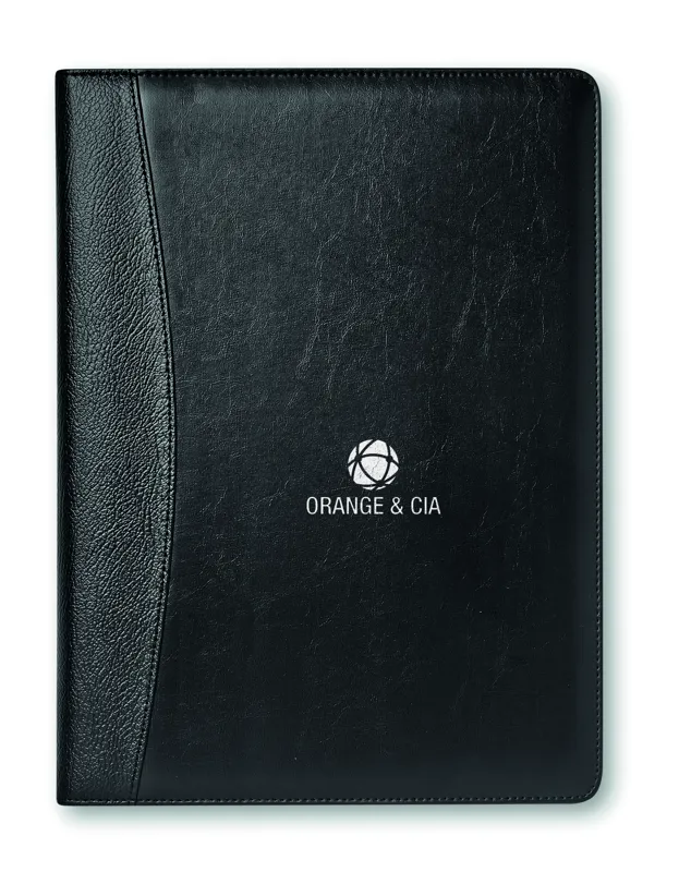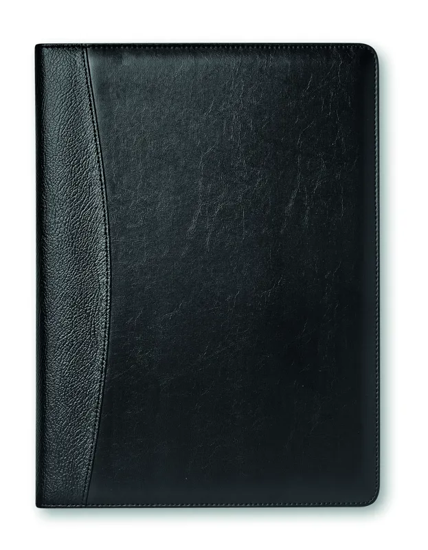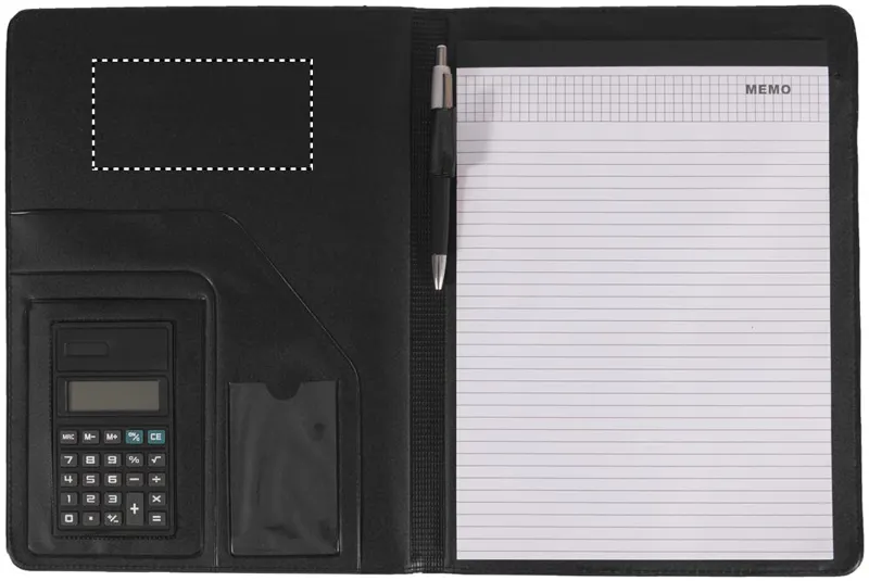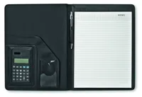 A4 műbőr mappa napelemes számológéppel. 20 oldalas vonalas jegyzettömb. Fém golyóstoll. Kéken író betéttel.