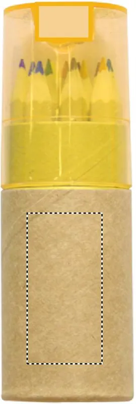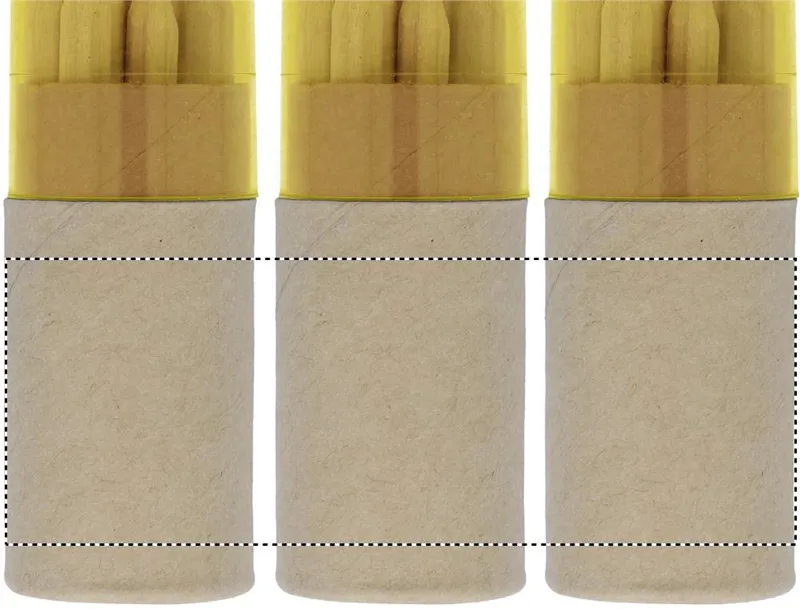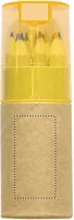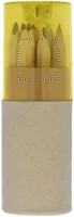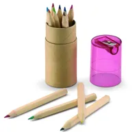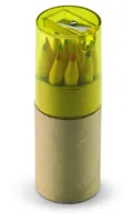 12 db színes ceruza henger alakú, újrahasznosított papír tokban. Hegyezővel az átlátszó tetőben.