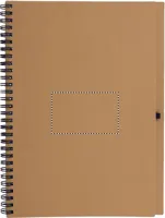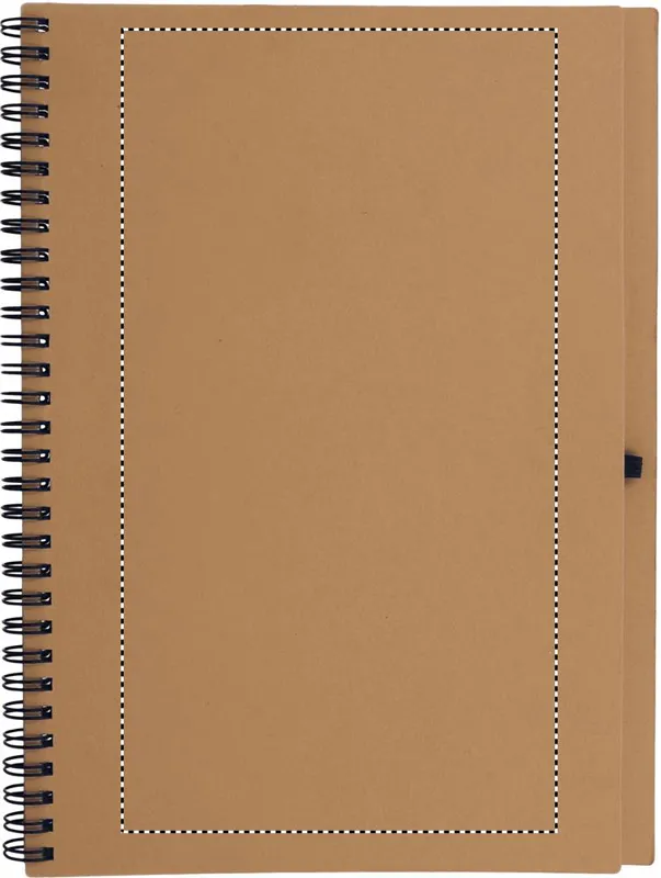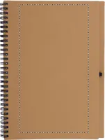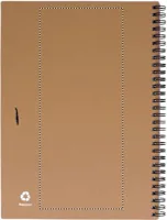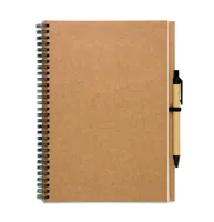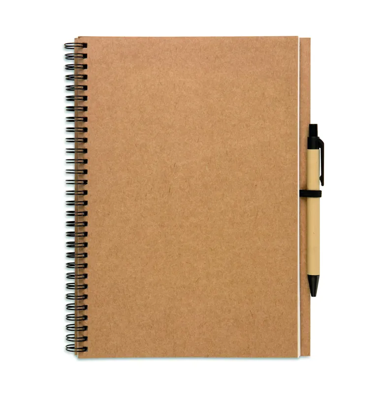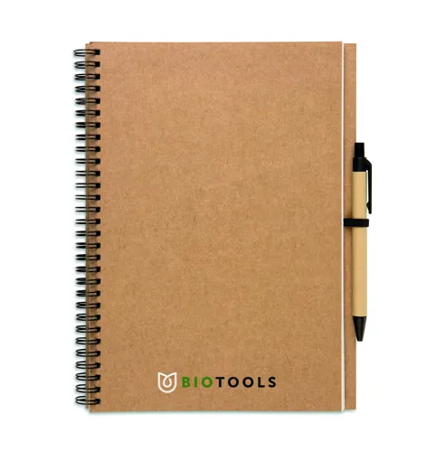 Újrahasznosított papír jegyzetfüzet tollal. Ikerspirálozott. 140 sima oldal (70 lap) újrahasznosított papírból. Fekete elasztikus tolltartó hurok. Nyomógombos golyóstoll újrahasznosított karton tolltesttel, biológiailag lebomló műanyag szerelvényekkel. Kéken író betéttel. FSC MIX CREDIT | P7.1 | FSC-C213206