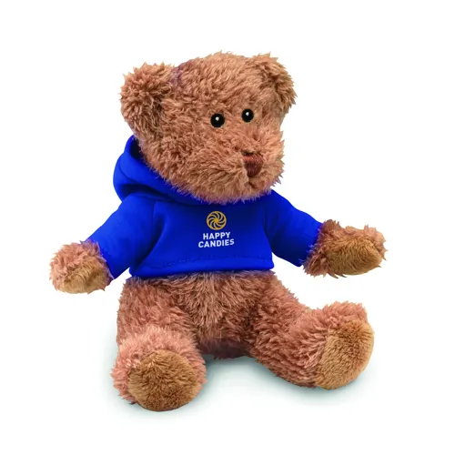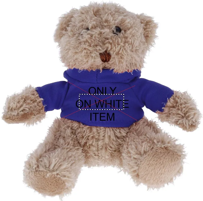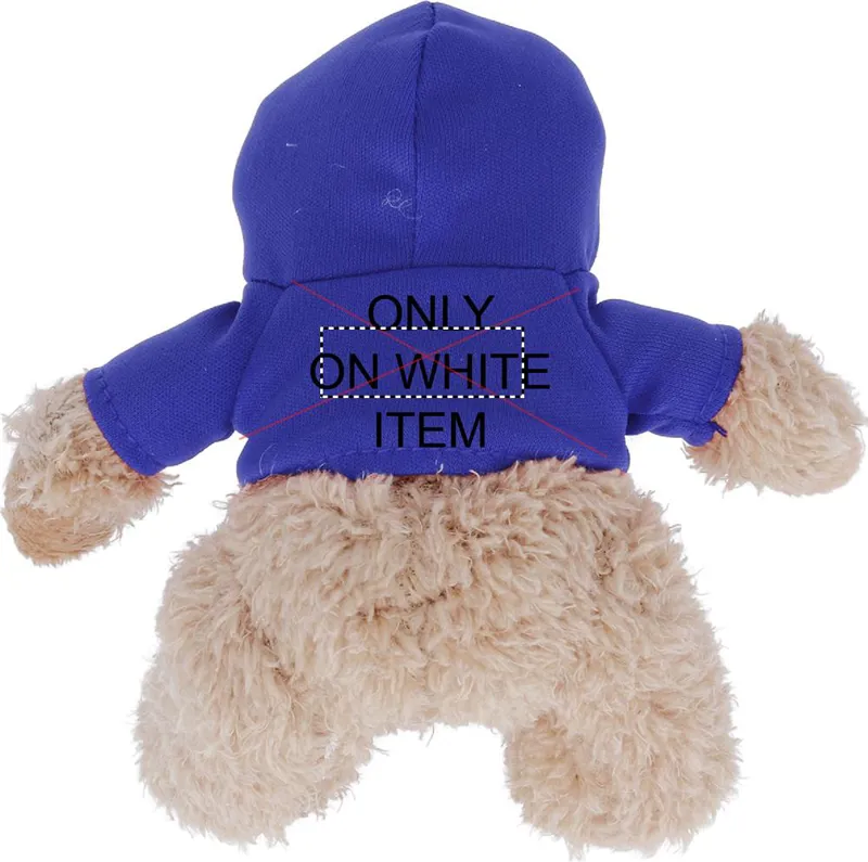 Kapucnis pólót viselő plüss maci. A szublimációs nyomtatás csak a fehér színű terméken érhető el.