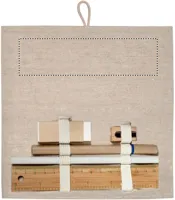 6 részes írószer készlet juta és pamut tokban. Tartalma: 15 cm-es bambusz vonalzó, papír ceruza, karton borítású golyóstoll kéken író betéttel, fa hegyező és radír. A bambusz természetes anyag, színében, mintázatában és méretében esetenként eltérő lehet.