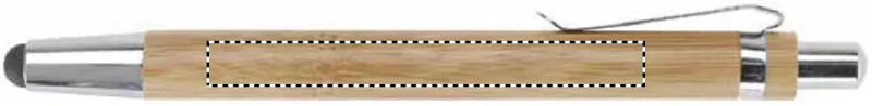 Nyomógombos bambusz golyóstoll fém csíptetővel, érintőheggyel. Kéken író betéttel. A bambusz természetes anyag, színében, mintázatában és méretében esetenként eltérő lehet.