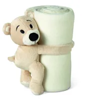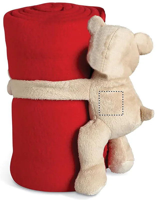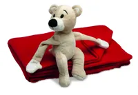 Polár takaró, melyet egy plüss maci tart a tépőzáras kezei között.