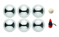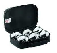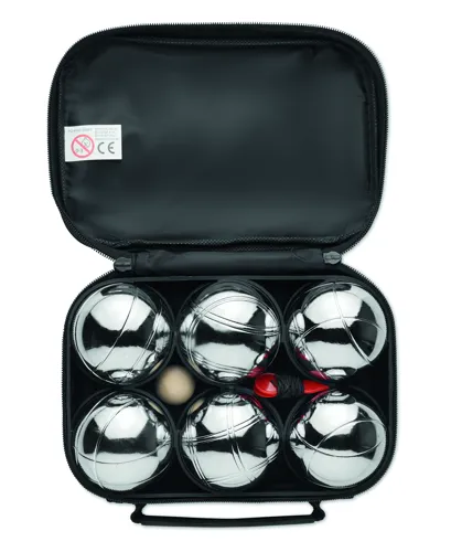 Fém pétanque szett 600D poliészter tokban. Egy labda átmérője: 7,3 cm. Egy labda súlya: 730 g.