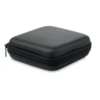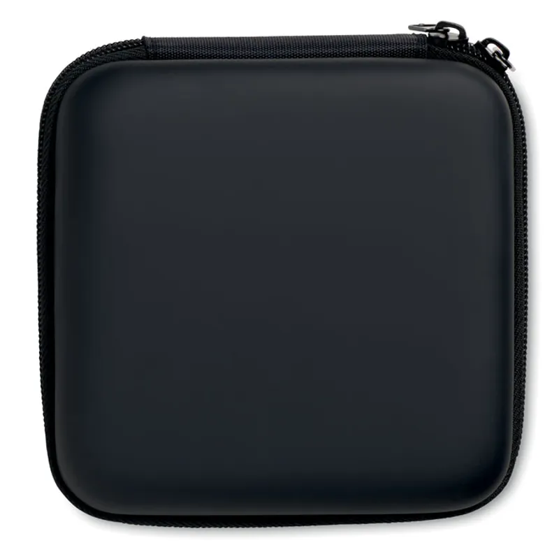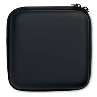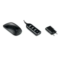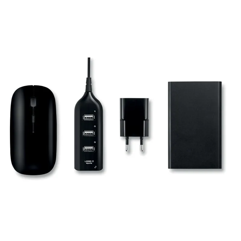Számítógépes kiegészítő szett EVA/PU tokban: 1 vezeték nélküli egér, 4 portos 2.0 USB csatlakozó, 1 EU-s csatlakozó és egy 4000 mAh külső akkumulátor. Mikro USB kábellel a töltéshez.