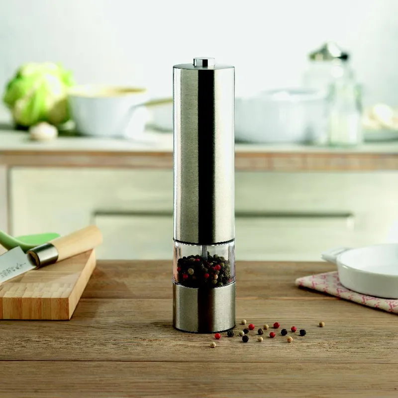 Rozsdamentes acél elektromos só- vagy borsörlő. 4 db AA elemmel működik, elem nélkül szállítjuk.