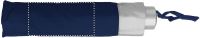21 colos, manuális, 3 szakaszos összecsukható esernyő 190T poliészter anyagból. Galvanizált fém nyél és csúcsok. Fekete bevonatú fém váz. Színes műanyag panelek belül ezüst betéttel. Színes műanyag markolat ezüst díszítéssel és fekete csuklópánttal. Hozzáillő tokban, ezüst díszítéssel.