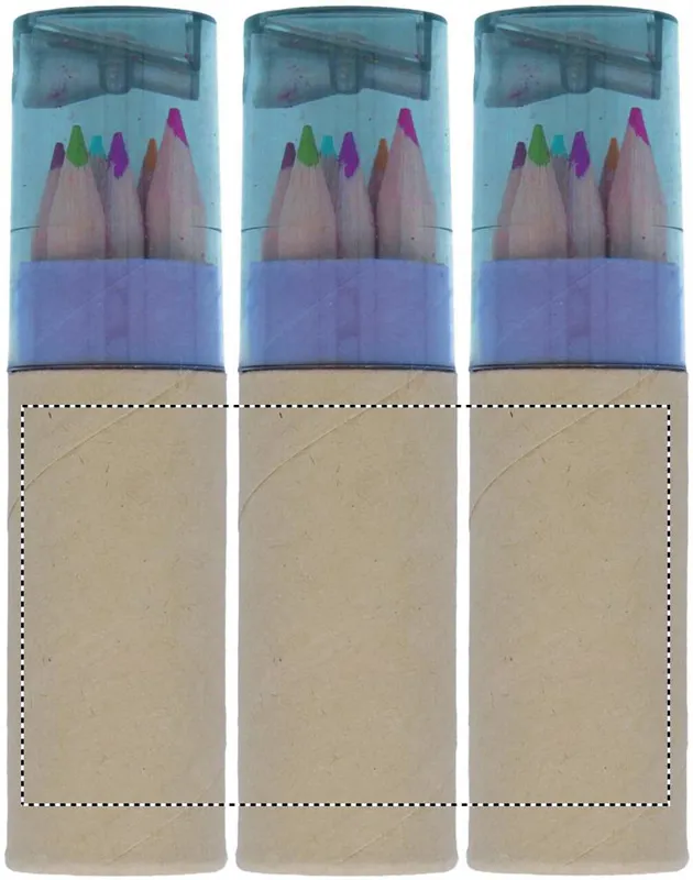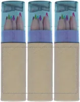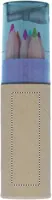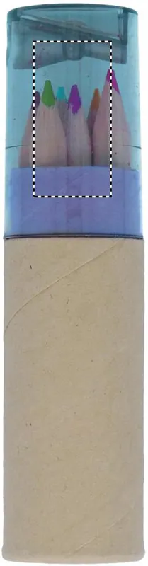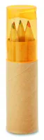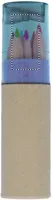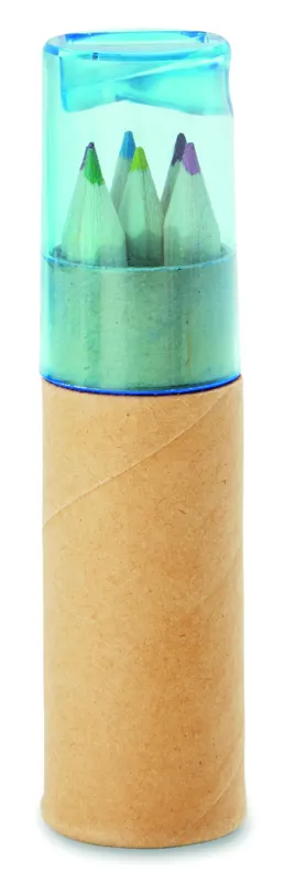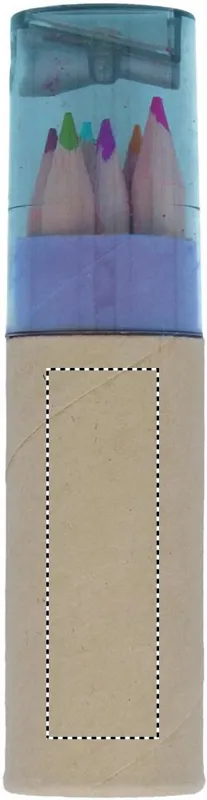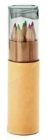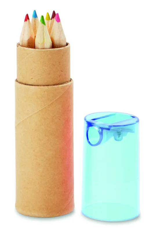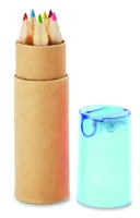 6 db színes ceruza henger alakú, újrahasznosított papírból készült tokban. Hegyezővel az átlátszó tetőben.