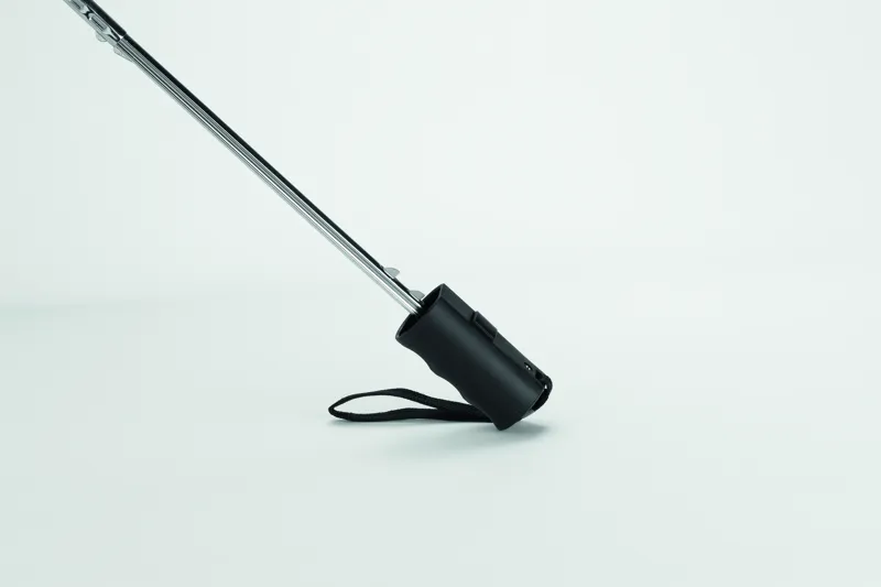 21 colos, 2 szakaszos összecsukható, automata esernyő 190T nyersselyem anyagból. Galvanizált acél nyél, váz és csúcsok. Fényvisszaverő díszítés a paneleken. Fekete műanyag markolat csuklópánttal. Hozzáillő tokban. Manuális záródás.