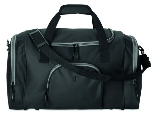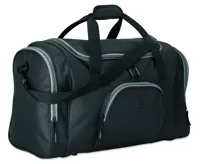 Sporttáska 600D poliészter anyagból. 2 cipzáras oldalsó rekesz és egy cipzáras elülső zseb fülhallgató kimeneti nyílással. Állítható és levehető vállpánt.